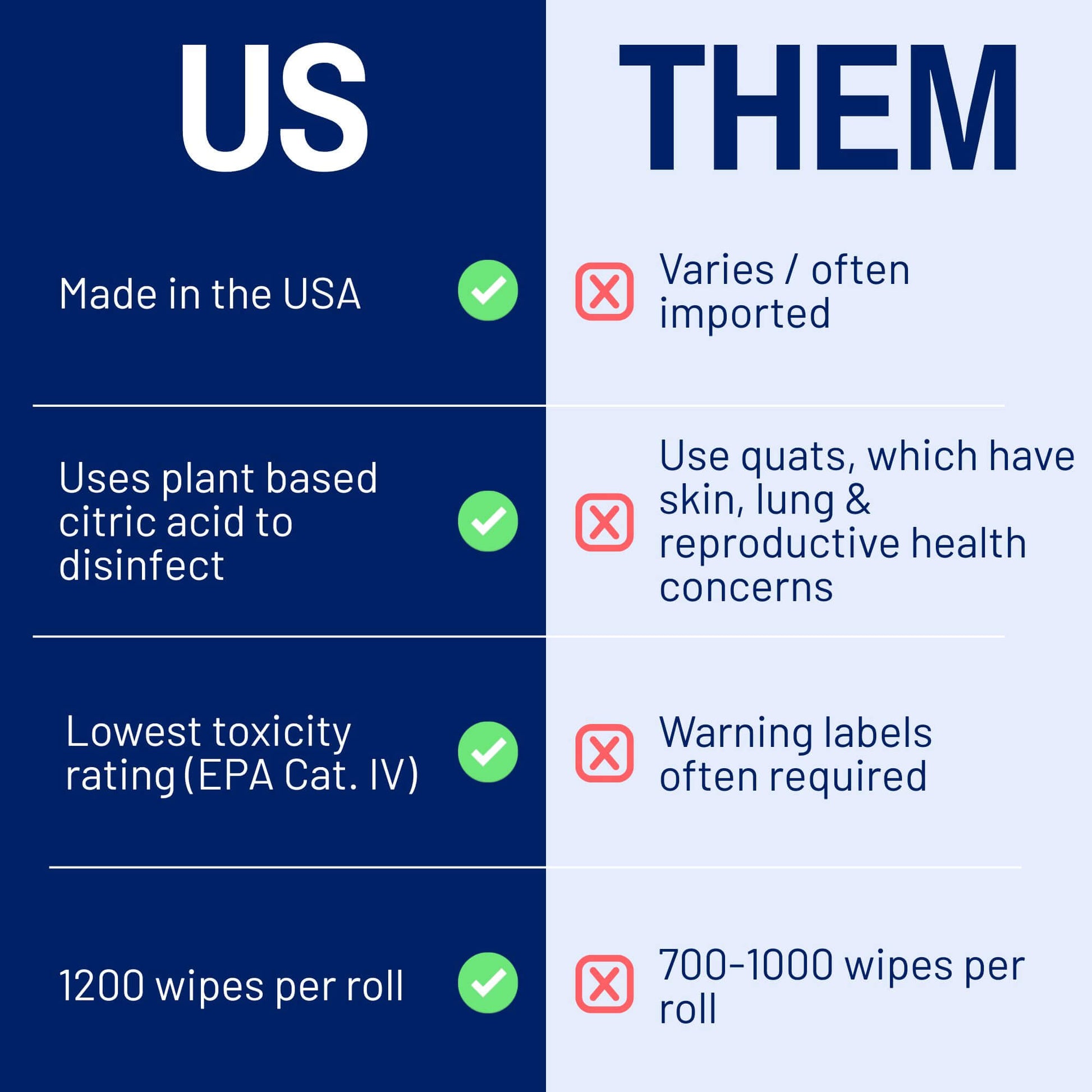 Our wipes are EPA registered to kill 99.9% of germs, earning the EPA's lowest possible toxicity rating (Category IV) - meaning no warning labels are required. It’s the safest choice for your members, all at the lowest cost per wipe in the disinfecting category.